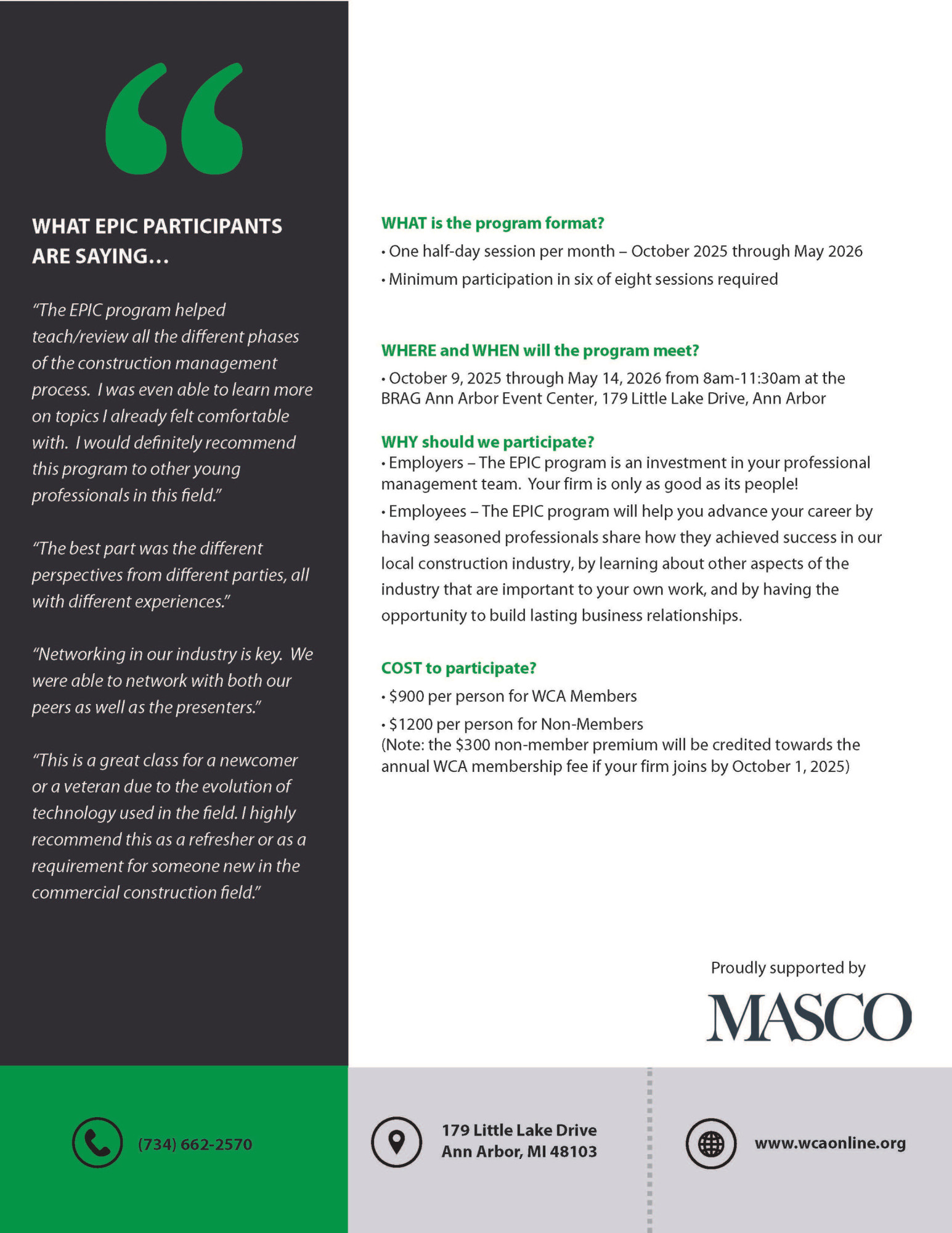 The EPIC program is targeted to those in their early years as a professional in the construction industry in the Washtenaw County area. The continued success of your firm and the local commercial construction industry depends upon our ability to expand the skills of individuals who are new to the industry, or their role within it, and to prepare them for the professional leadership roles of tomorrow. The Washtenaw Contractors Association’s Emerging Professionals in Construction Program (EPIC) can help to build and support leaders in your organization.
